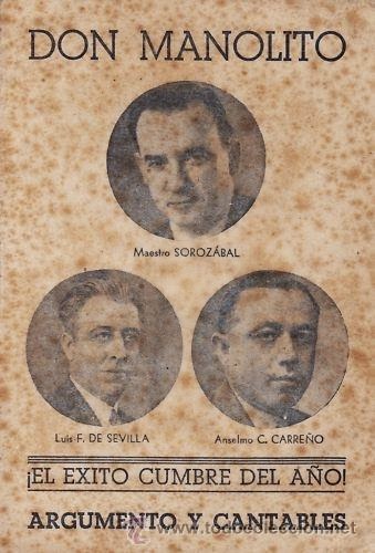 Don Manolito es un sainete en dos actos y tres cuadros, cuya música fue compuesta por Pablo Sorozábal, siendo los libretistas Luis Fernández de Sevilla y Anselmo Carreño. Se estrenó en el Teatro Victoria de Madrid, en abril de 1943. Fue un gran éxito de público, que no de crítica, ya que la censura impidió que la prensa madrileña publicara ningún artículo sobre el estreno de la misma, pese al piropo a Madrid que conlleva gran parte de la obra. Sigue leyendo «Lírica … y fútbol»